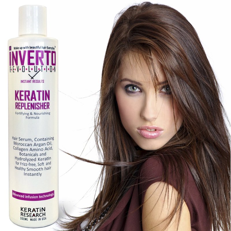 Inverto Keratin Replenisher 10oz Inverto Keratin Replenisher: Beyond the amazing performance and quality of this product, it's a Super Value! it is an 10oz bottle comparing to Keratin Complex and other brands who only give you 1.7oz. Our Keratin Replenisher: Triple Nourishing Fortifying & Conditioning Formula. Comes in a form of hair lotion, Containing Pure Moroccan Argan Oil, Botanicals and Inverto Hydrolyzed Keratin for Frizz-free, Soft and Smooth hair. by now you have learned that Inverto Products continuously delivering performance and great satisfaction. How does it work? The Replenisher opens the cuticle and enters to infuse Keratin proteins and emollients into the hair. Its deep penetrating action repairs and revitalizes hair during blow drying or ironing and closes the cuticle to entrap nourishment. Optimized for use as a maintenance to the Keratin Treatment and for any type of hair needing care.