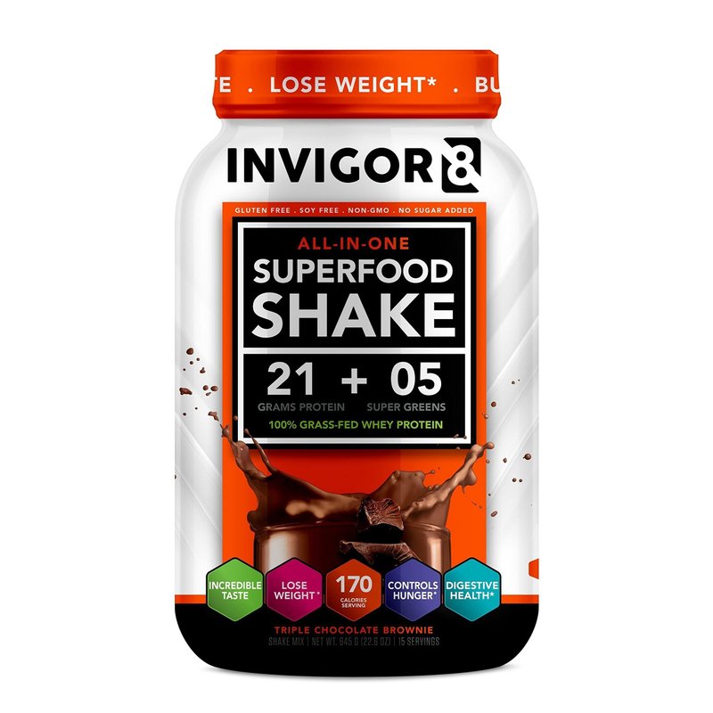- INVIGOR8 SUPERFOOD SHAKE. Build lean muscle, control hunger, reduce body fat, and promote healthy digestion. This delicious triple chocolate brownie shake gives you premium grass-fed whey protein, pre and probiotics, and immunity boosters for health from the inside out