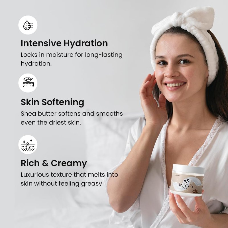 - π How to Use for Best Results: Apply a generous amount of INYVA ButterGlow Shea Body Butter to clean, dry skin. Massage gently in circular motions until fully absorbed. Use daily for best results, especially after bathing or showering, to lock in moisture and keep your skin hydrated, nourished, and glowing