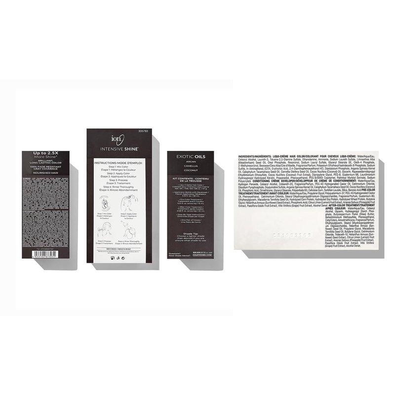 Intensive Shine has been formulated to provide maximum shine using a proprietary blend of Moroccan Argan Tahitian Tamanu Camellia and Coconut oils. This unique blend of precious oils provides brilliant color while helping to transform your hair from weak and dull to silky shiny and natural. Transform hair from weak and dull to smooth shiny and healthy. Brilliant long-lasting color. 100% fade resistant gray coverage. Non-Drip liqui-creme formula is easily applied. Pleasant fragrance. Complete kit contains: hair color pre-filled applicator bottle with ion Sensitive Scalp Creme Developer pre-color treatment after color treatment gloves and step by step instructions.