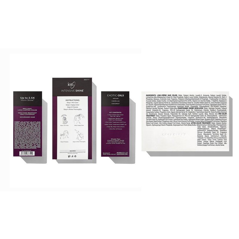 Intensive Shine has been formulated to provide maximum shine using a proprietary blend of Moroccan Argan Tahitian Tamanu Camellia and Coconut oils. This unique blend of precious oils provides brilliant color while helping to transform your hair from weak and dull to silky shiny and natural. Transform hair from weak and dull to smooth shiny and healthy. Brilliant long-lasting color. 100% fade resistant gray coverage. Non-Drip liqui-creme formula is easily applied. Pleasant fragrance. Complete kit contains: hair color pre-filled applicator bottle with ion Sensitive Scalp Creme Developer pre-color treatment after color treatment gloves and step by step instructions.