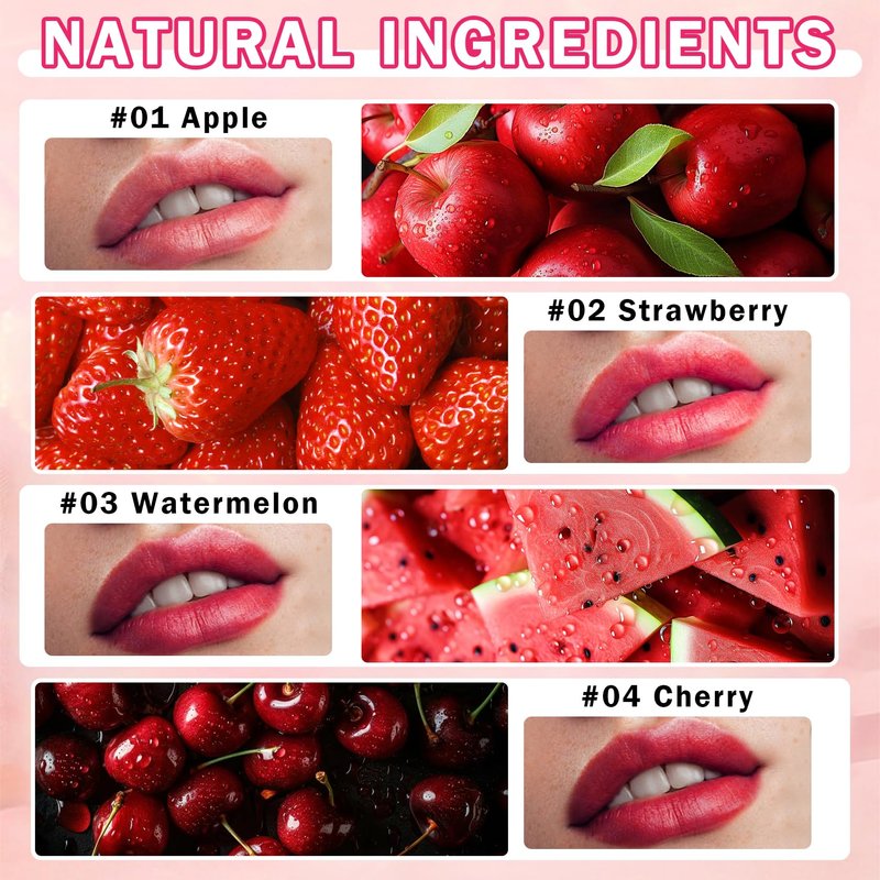 - EXQUISITE GIFT: Lipstick set includes 4 colors lip tints (Apple/Strawberry/Watermelon/Cherry) and 2 lip masks. Small and exquisite, easy to carry and travel, and lip stain set can be given as a holiday gift to family and friends