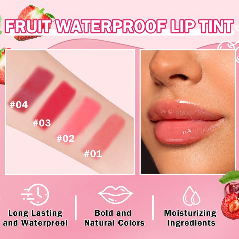 IONSGAKO 4 Colors Lip Tint Stain Set Tinta Para Labios Water Tint Lip Stain Long Lasting Waterproof Non-sticky Lightweight Matte Finish Smudge-proof Lip Makeup(Apple/Strawberry/Watermelon/Cherry)