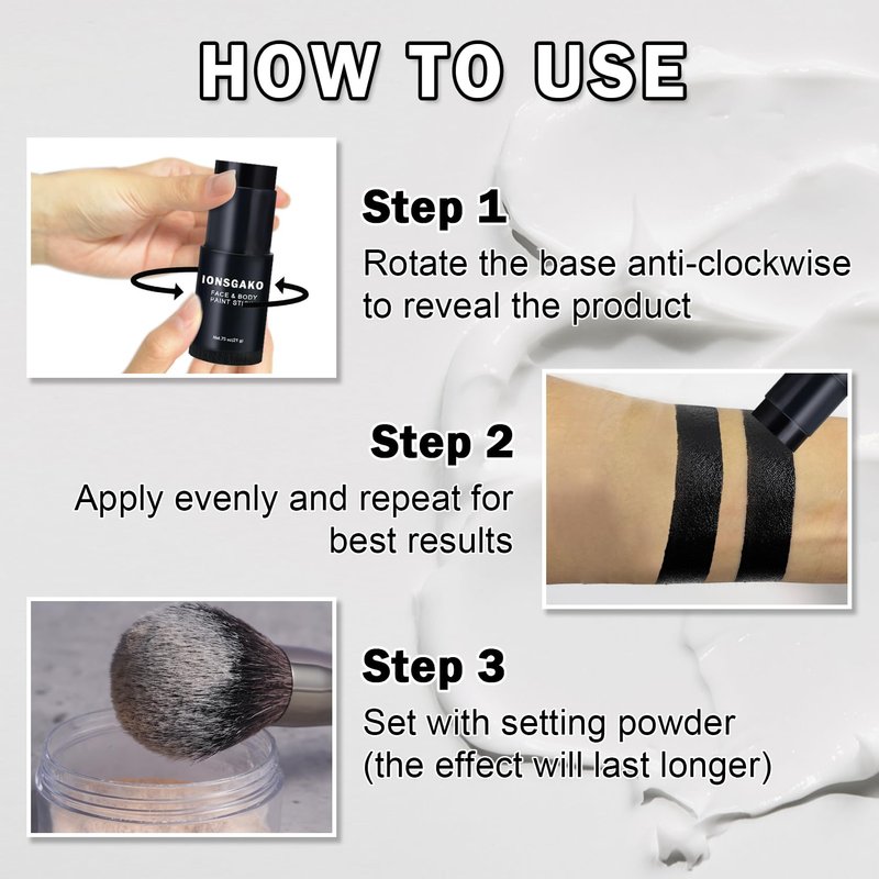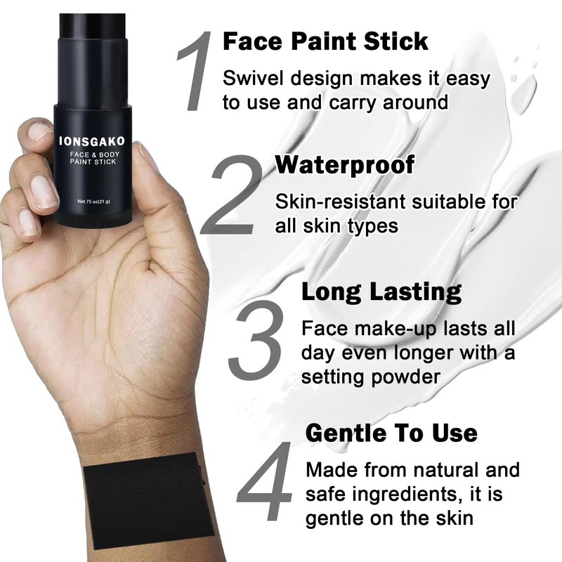 - EASY TO CLEAN: Halloween face paint stick uses a safe and gentle formula, vegan and cruelty-free, and no animal testing. White foundation goth face paint can be used with black face paint. Use makeup remover wipes or professional makeup remover oil/olive oil to remove