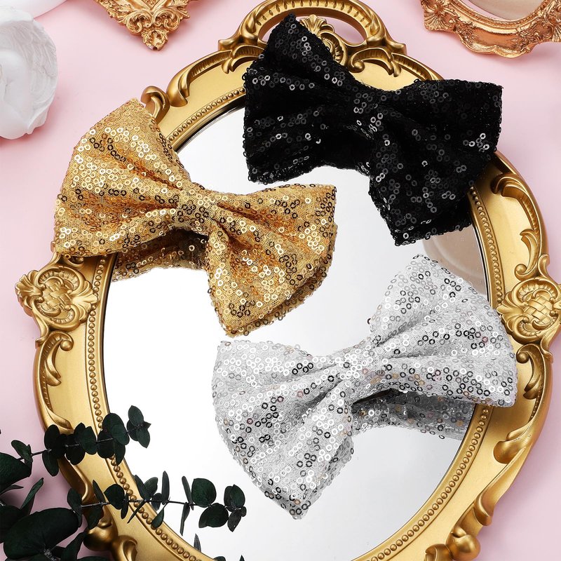 Ipetboom 3Pcs Glitter Bow Hairpin Black Gold Sliver Bling Hair Bows Sparkling Sequin Bow Tie Hair Clip Girls Hair Bows for Girls Hair Accessories