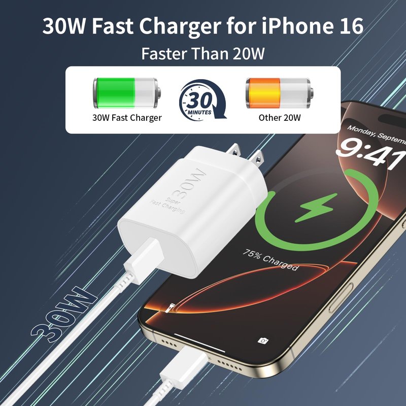- 【30W iPhone 16 15 Fast Charger】PD 3.0 quickly charge USB C port provides 4X faster charging speed than original 5W iphone chargers do. It can charge iPhone 16 up to 65% in just 30 minutes which saving over 1.5hrs for you. The PD 30W iPhone 16 15 Charger USB C Block with 10ft extra long USB C to USB C fast charger cable cord provide Max 30W output power,10% faster than the original 20W USB C charger