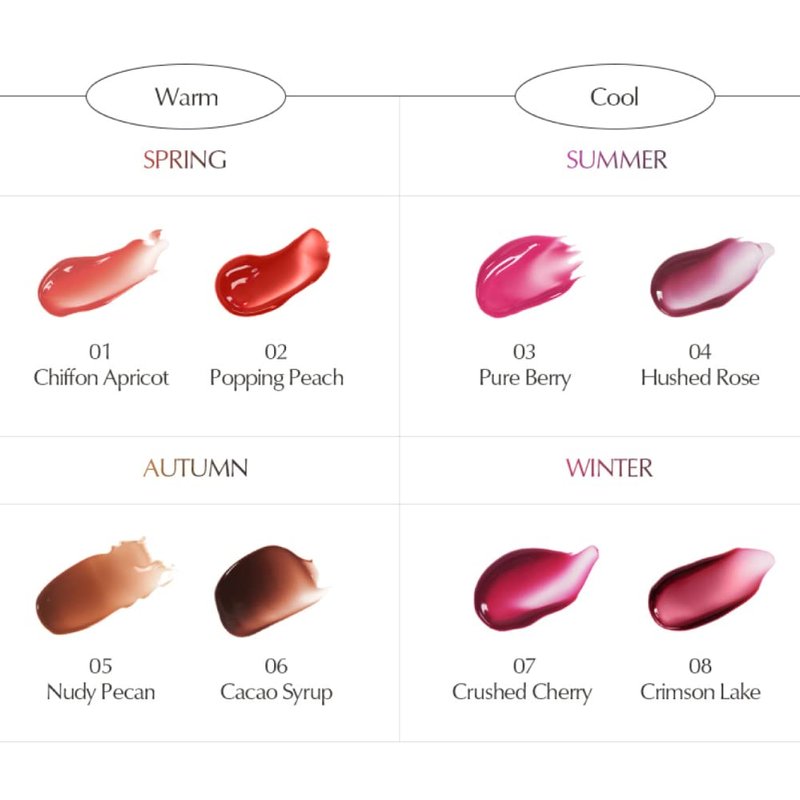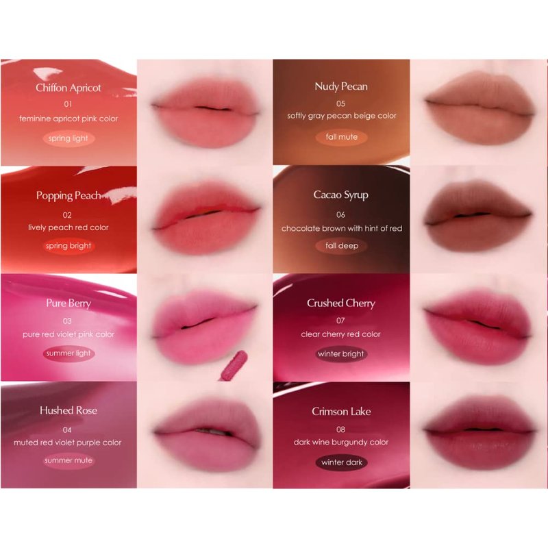 Water tint that applies thinly with moist, transparent texture to give your lips clear glow glass first look and soft, velvety finish look. Personalized color palette that is designed for your color tone of spring/summer/fall/winter to create perfect color match. Thorough covering formula allows for smooth, velvety look without any dead skin definition. Keep your soft tint all day with strong adhering water sheer tint that stays on the lip during light wear. Menthol property in lipstick gives a light, soft, and natural plump for youthful, lively mood.