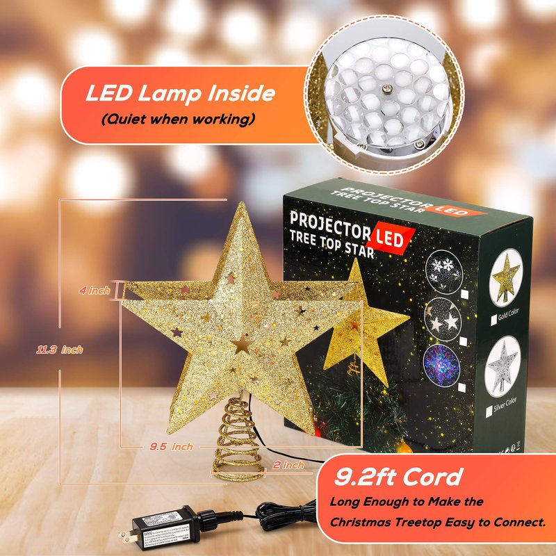 - 🎄LED Snowflake Projector Feature Adds Holiday Atmosphere - Built-in projector lamp inside, this star Christmas tree topper can project every clear snow flakes that move around on the ceiling. It will be the most unique decoration of this Christmas and a nice glittery addition to your Christmas tree.