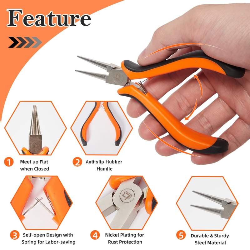 - 【High Quality & Durable】Jewelry pliers kit is made of drop forged carbon steel with nickel plating, the small pliers are better rust protection and stronger corrosion resistant, which is more durable. The jewelry plier with smooth polished surface and non-slip handle is designed for jewelry making and repair, without worry about scratching or leaving marks on your jewelry. Spring design allows you to cut and bend more easily and Bi-material comfort nonslip grip handle offers effective work.