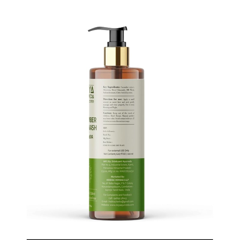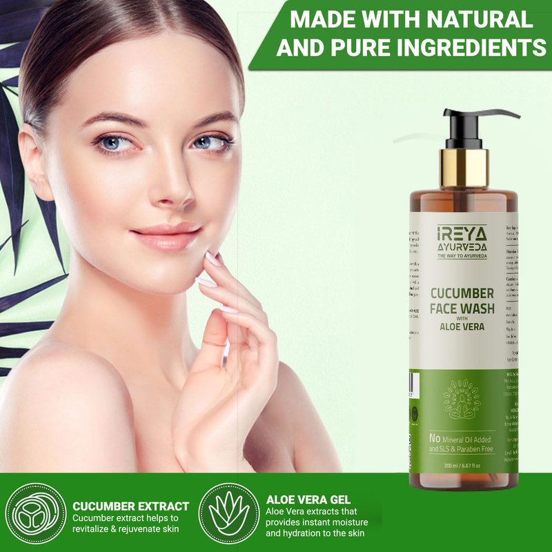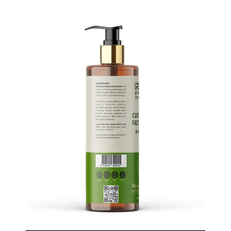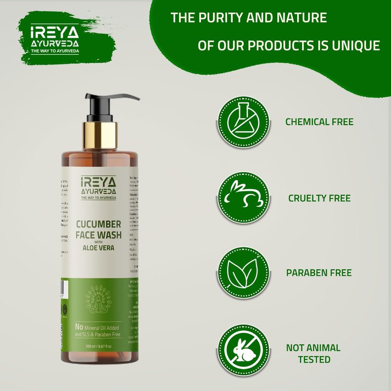 - Ireya Ayurveda Cucumber Aloe vera face wash Made With Cucumber extract & Aloe vera gel. All our Ireya Ayurveda Products are made with natural and herbal ingredients. Free from SLS, silicones, parabens, mineral oil & dyes.Cruelty-Free, Vegan, Preservative Free.
