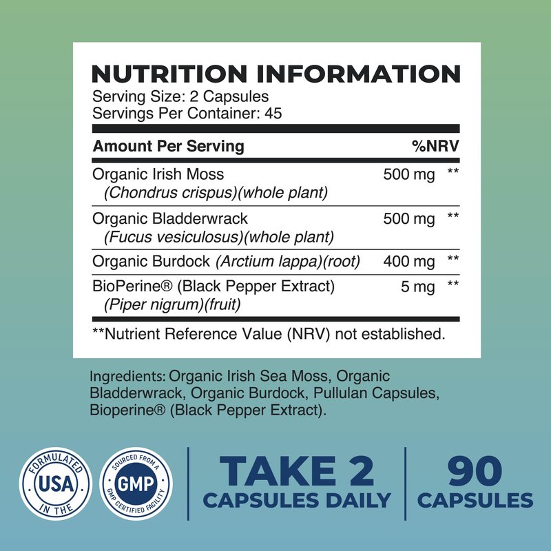 - THYROID & IMMUNE SUPPORT: Irish Sea Moss and Bladderwrack are both excellent sources of Iodine for thyroid support, metabolism, and detoxification.* This formula also features important immunity nutrients like Omega-3 Fatty Acids, Iron, and Vitamin A.*