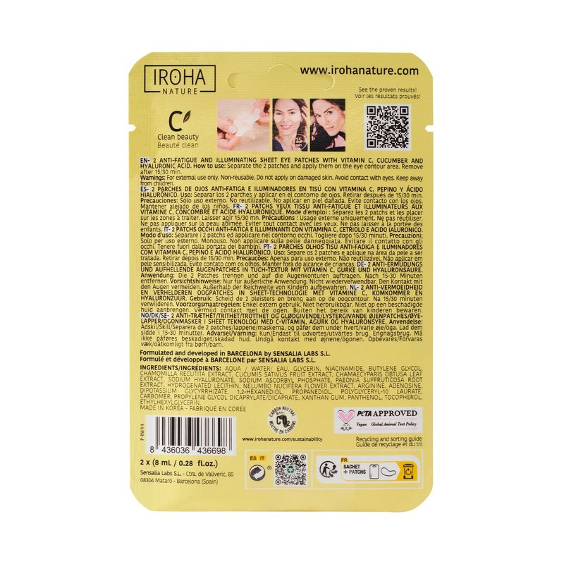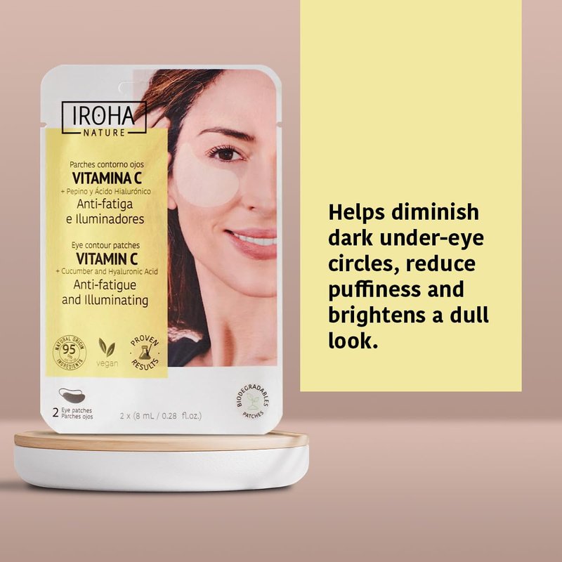 Eye mask reduces eye bags and brightens the dull look thanks to its formula with Vitamin C, cucumber, and hyaluronic acid. These are anti-fatigue and illuminating eye patches that help diminish the dark tone of dark circles. They provide a decongestant effect that soothes and refreshes the eye contour area. The patches contain Vitamin C, an antioxidant and depigmenting agent that brightens, evens out the skin tone, and increases collagen production; cucumber, a decongestant and refreshing active ingredient that reduces puffiness of the eye bags; and hyaluronic acid, which provides an immediate moisturizing action. The product is suitable for all skin types, especially for fatigued skin. To use the patches, first separate both patches and apply them under the eyes on clean and dry skin. Leave them on for 15 minutes. Then, remove and gently massage with the fingertips. Its use is recommended three times a week. Iroha Nature products are PETA certified. Pack - Contains 5 pieces