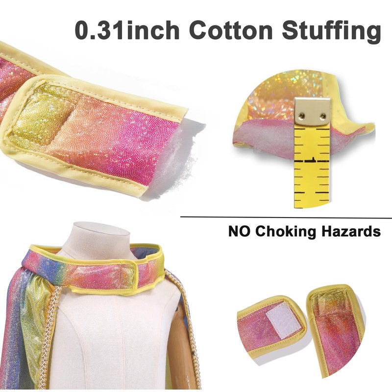 - Your Voice, Our Priority: No Glitter Bombs! Based on 300+ valuable customer experiences, we’ve enhanced our princess costume set to Fairy Tale Glamour 2.0, prioritizing your child's safety and comfort. The princess cape is made from luxurious shiny fabric, eliminating sharp sequins to prevent shedding—perfect for endless adventures in the magical world of make-believe