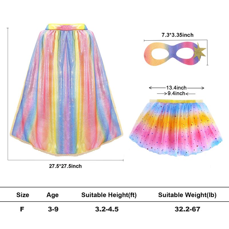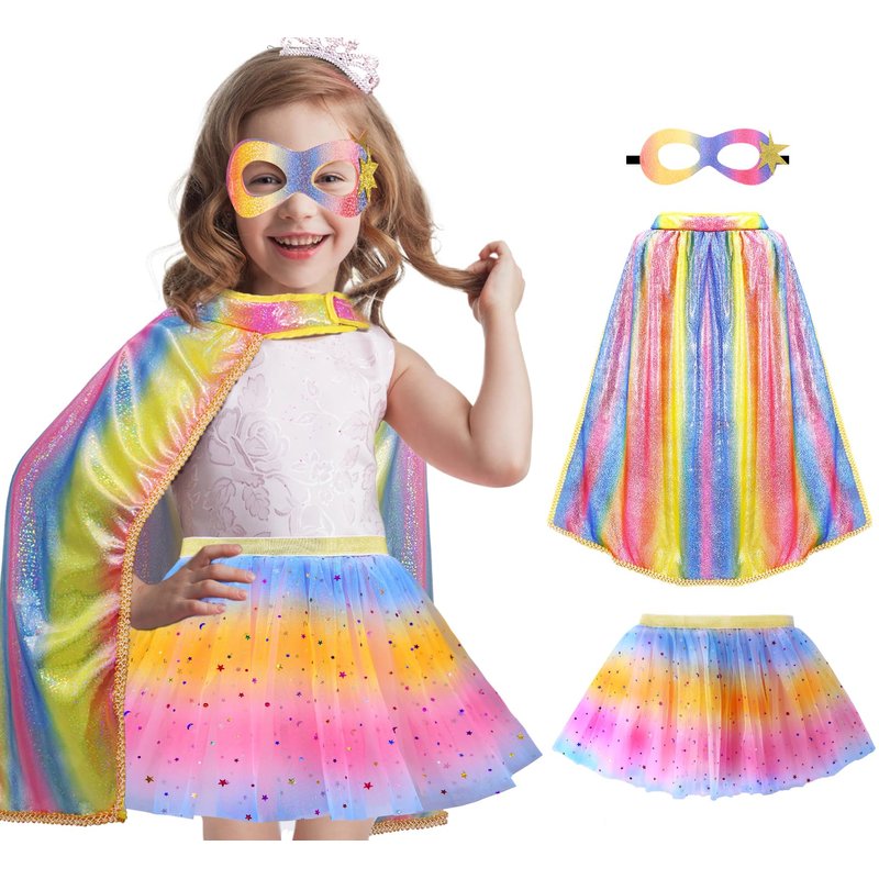 - A True Transformation: Get ready for royal ball dancing with our Princess Cape, Mask, and Tutu Set! The cape for girls features gold trims and a cushioned neckline for a snug, comfortable fit. Paired with a shiny star tutu skirt and a glitter mask, your little one will love twirling and bringing fairy tales to life