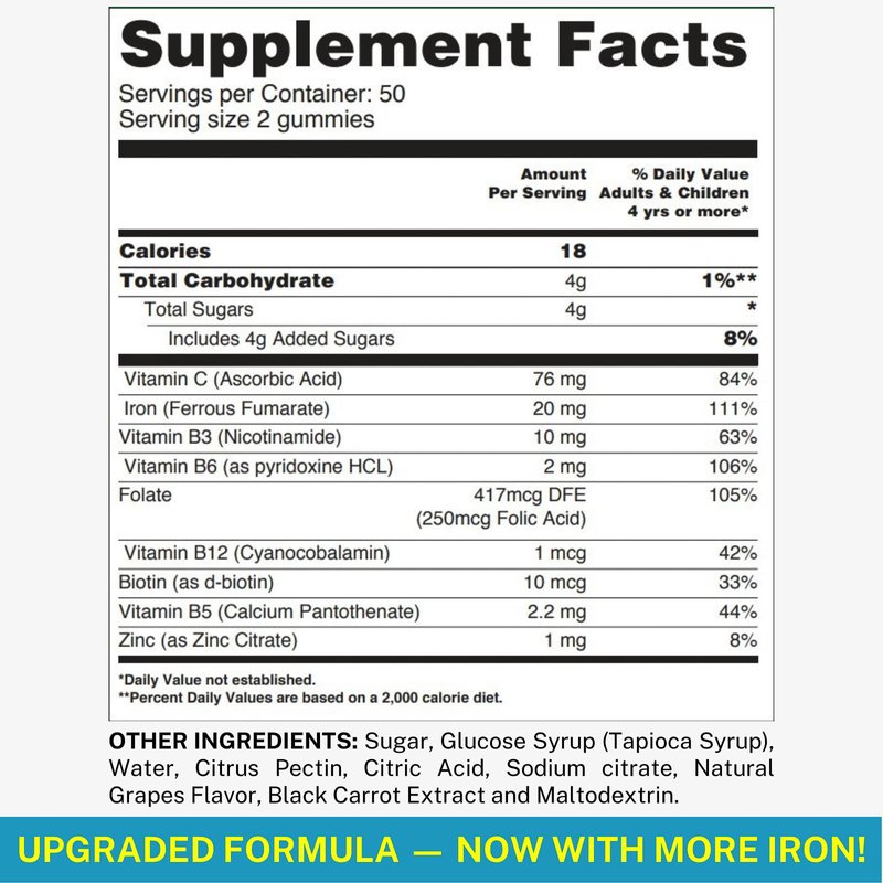 - MULTIVITAMIN WITH IRON GUMMY: Each bottle contains 100 delicious naturally grape-flavored chewable iron gummies that are an excellent source of Iron (Fe), Vitamin C, A, Vitamin B Complex (B3, B5, B6, B12), Folic Acid, Biotin, and Zinc.*