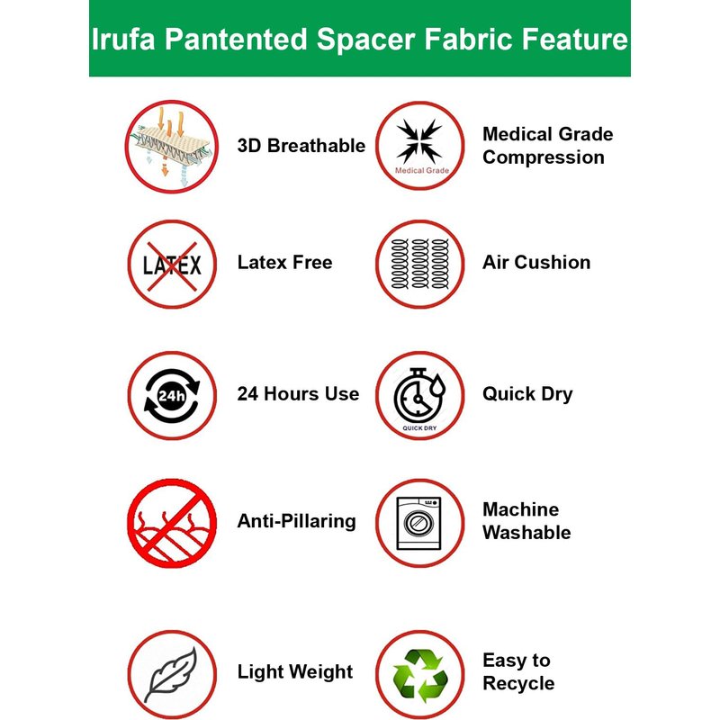Only Spacer fabric have air cushion effect. Not all the spacer fabrics are the same. Most of spacer fabric in the market do not have enough compression. Irufa have developed a series medical grade compression Spacer fabric and Braces. Spacer Fabric have much more breathable and moisture wicking than Neoprene or PU foam. Not like most of tubular knitted fabric have the latex content and allergy problem. Spacer fabric is latex free and hypo-allergenic. Elastic spacer fabric is much more expensive and comfortable than non-elastic spacer fabric. We choice elastic spacer fabric to meet the customer's need. The criteria to judge a good material for sporting & Medical braces are elastic, enough compression, comfortable, breathable, durable, no allergy, easy care, and additional added on functions. Our patented pacer Fabric can meet all these criteria and should be one of the best material for the sporting & Medical Braces Irufa patented Spacer Brace is 3D breathable, compression and support to treat pain and chronic problem. The Braces is adjustable, easy use, comfortable and effective. Irufa’s patented material are neoprene free and latex free, so you don't have to worry about skin irritations.