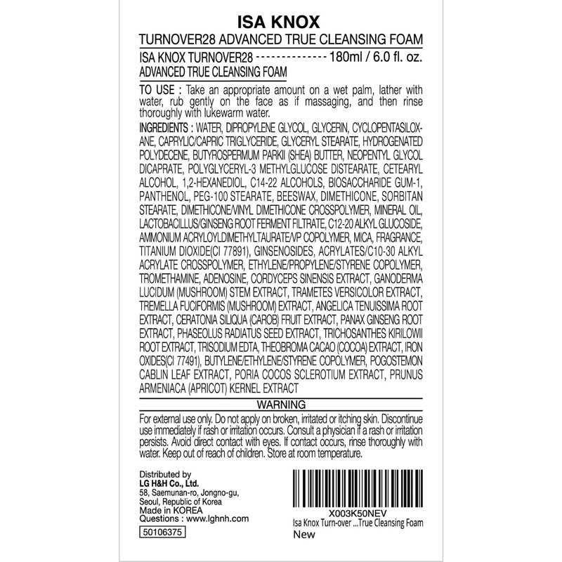 - ISA KNOX TURNOVER 28 ADVANCED TRUE CLEANSING FOAM (180ml/6.1fl oz) - Unveil vibrant, healthy skin with our botanical cleanser enriched with protein enzymes and botanical mucin. This cleanser effectively removes impurities from your skin while preserving essential moisture.