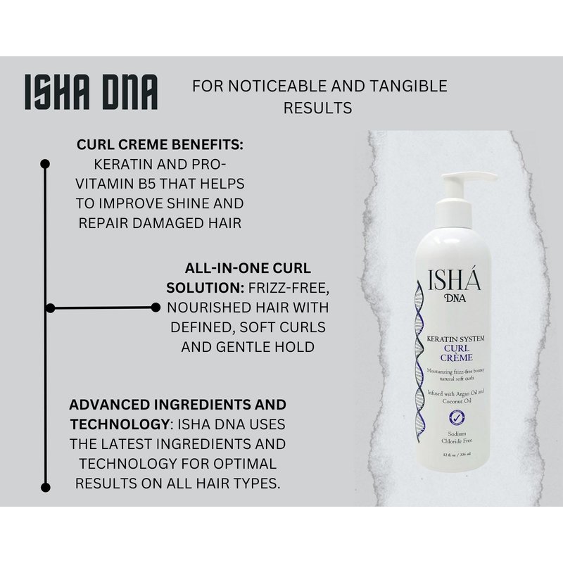 - ISHA DNA Keratin System Curl Creme Creates Frizz Free Soft Curls While Nourishing Your Hair With This Argan And Coconut Oil Enriched Baml. Contains Keratin And Pro-vitamin B5 That Helps To Improve shine And Repair Damaged Hair