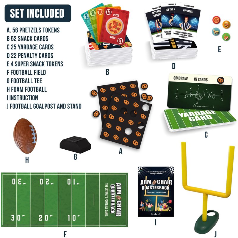 - Unique Blend of Cards & Action – Mix strategy and luck with 52 Snack Cards and 25 Penalty Cards to outsmart opponents. A great addition to family games for adults or football gifts for girls and boys ages 8-12 years and up.