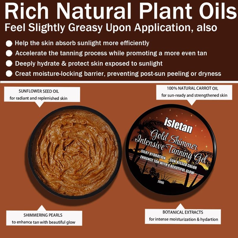 - Quick Results. Achieve a natural, darker, darker tan with less exposure to the sun or sunbed with our premium isletan intensive tanning gel. Advanced tanning system ( Carrot + Coconut + Sunflower + Jojoba Olive Oils) enhances tan acceleration, providing a deep, rich and radiant sun-kissed color. Only the high quality ingredients are carefully mixed together allowing the tanning gel for outdoor sun to absorb fast, get you tanned even faster by stimulating and increase melanin formation to accelerate the tanning process.