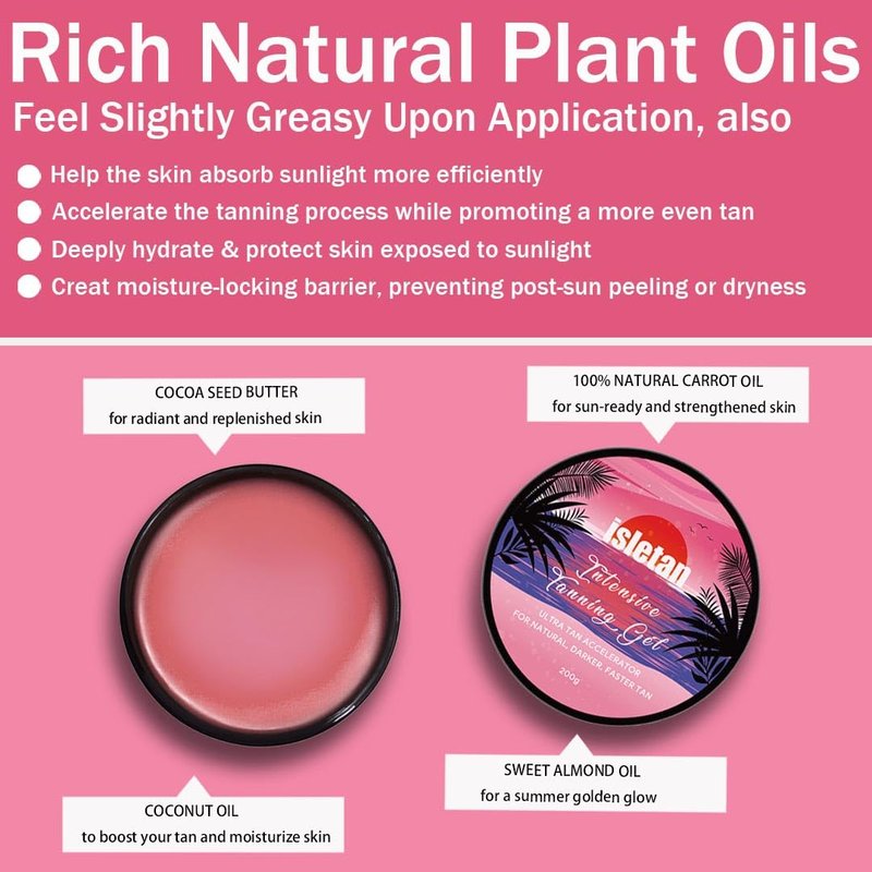 - Everything your skin needs is in one jar - 100% natural carrot oil in this natural sun tan accelerator for sun-ready and strengthened skin, organic coconut oil to boost your tan, sweet almond oil for a summer golden glow and cacao butter for radiant and replenished skin. Tattoo & Color Fade Protector Prolongs the life and radiance of your tattoos and tanning results. Premium isletan combination of this carrot sun tanning cream gel became popular for ultra dark tan lovers too!