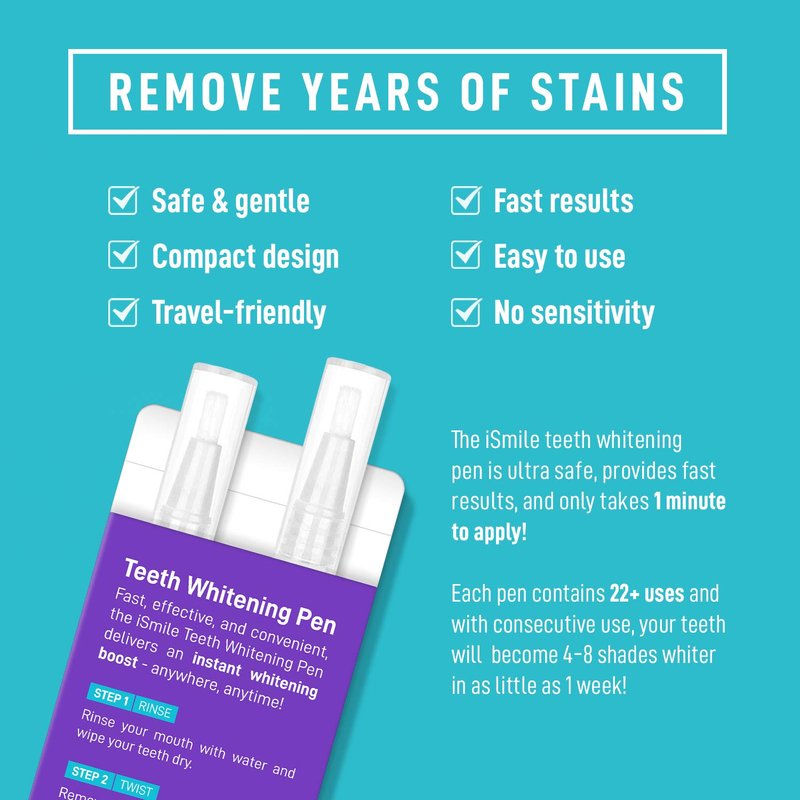 Fast, effective, super-convenient on-the-go teeth whitening. The iSmile Teeth Whitening Pen provides a whitening boost that seeps into nooks & crannies, and its soft-bristle brush provides quick and easy no-mess applications.