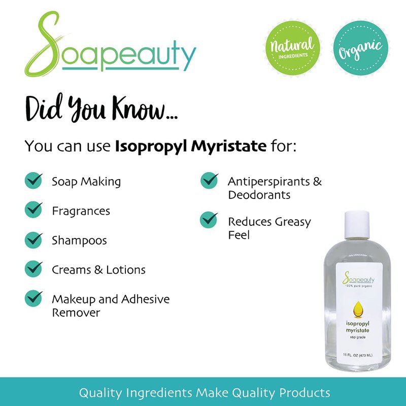 - SATISFACTION / QUALITY GUARANTEED: Soapeauty supplies bulk Isopropyl Myristate to some of the nations largest brands and we stand behind every product we sell.