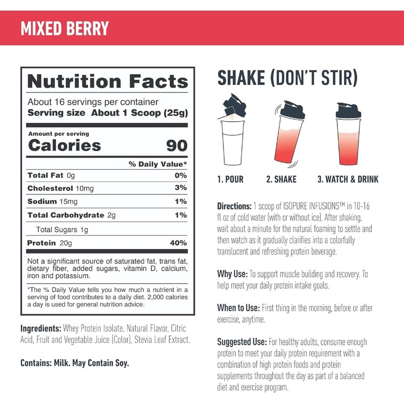 - REFRESHING FLAVOR: Isopure Infusions Mixed Berry delivers a juicy, thirst quenching fruity burst of flavor making it tastier than ever to add more protein to your day.