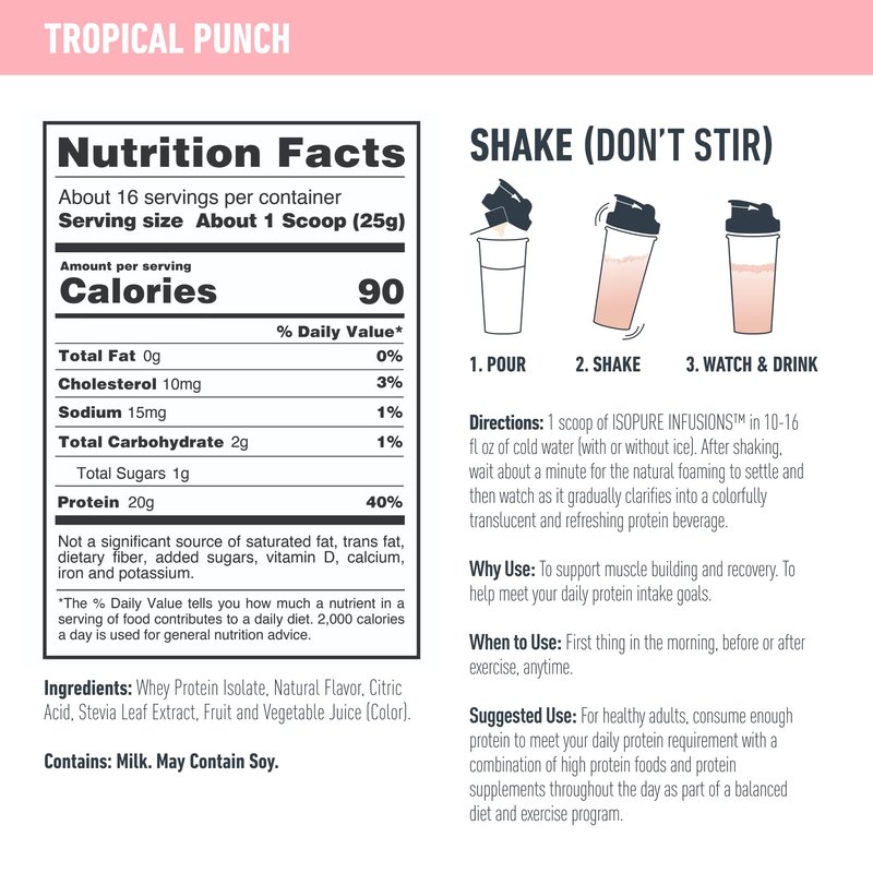 - REFRESHING FLAVOR: Isopure Infusions Tropical Punch delivers a juicy, thirst quenching fruity burst of flavor making it tastier than ever to add more protein to your day.