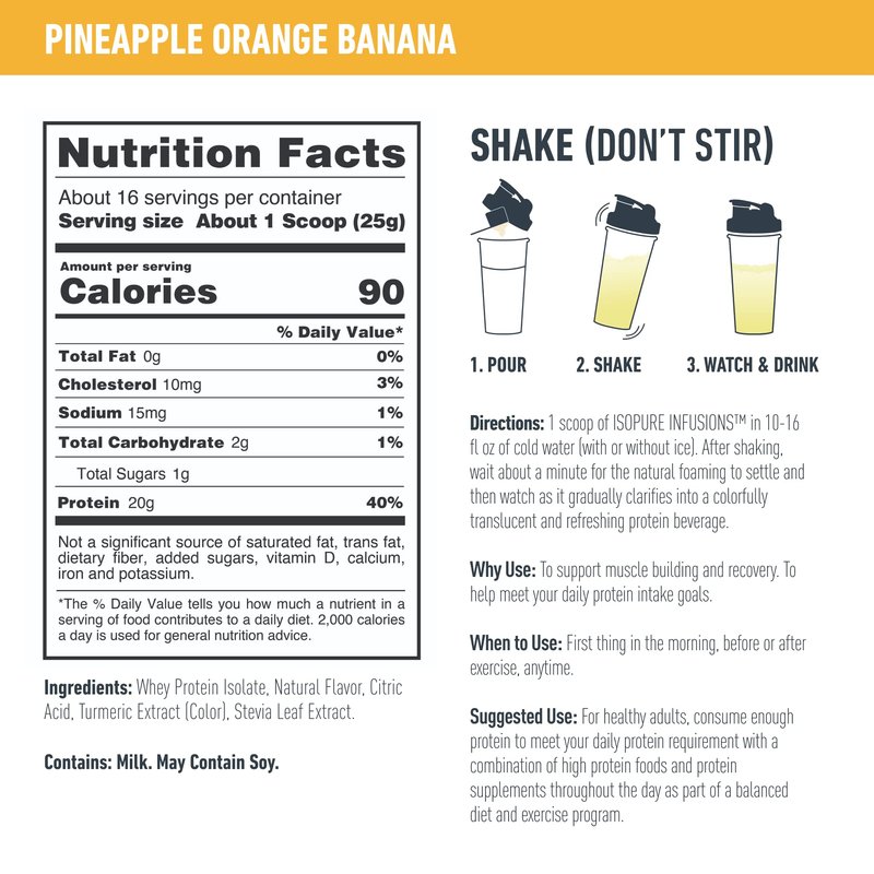 - REFRESHING FLAVOR: Isopure Infusions Pineapple Orange Banana delivers a juicy, thirst quenching fruity burst of flavor making it tastier than ever to add more protein to your day.