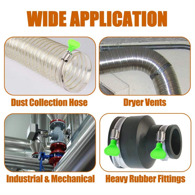 - 【WIDE APPLICATION】 These unique clamps are typically used in securing duct work, dryer vents, dust collection hoses, piping, large cable, pvc tubing and more. Ideal for use in automotive, industrial, mechanical, agriculture, boat/marine, shield, recreational vehicles, household and more. Works for both indoor or outdoor use.