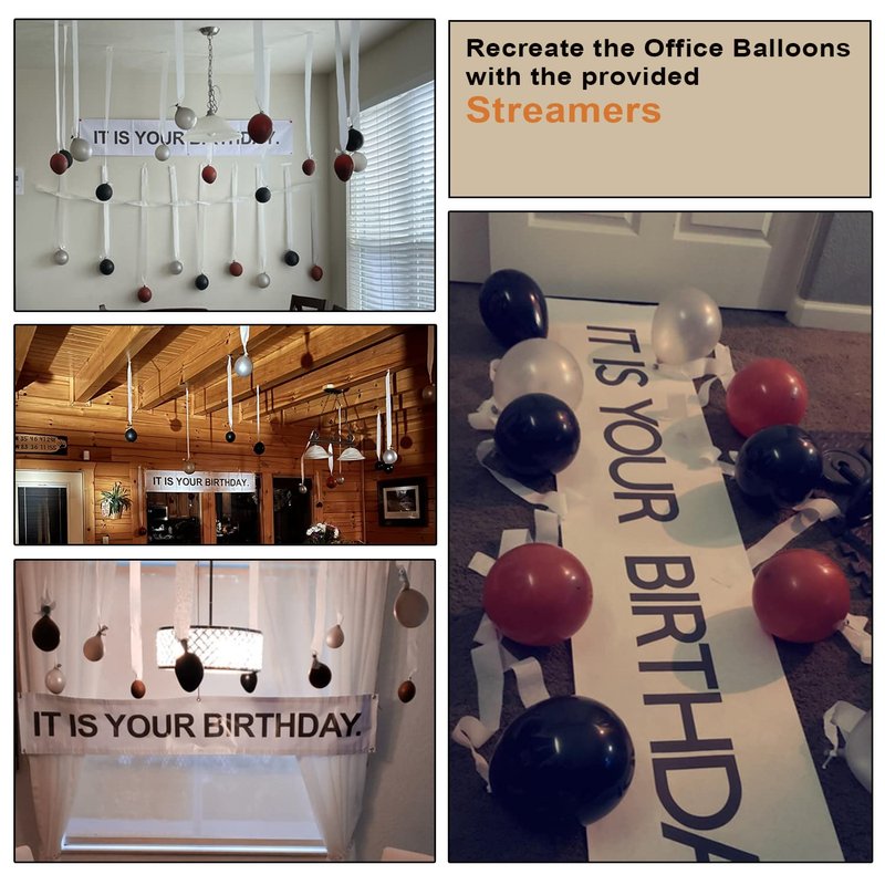 - This office themed birthday decorations set includes:1 X Vinyl Banner,2 X white streamers,15 X Gray Balloons,15 X Black Balloons and 15 X Brown Balloons,1 Masking Tape to create a true replica of The Office scene!