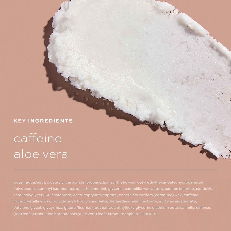 - Caffeine: reduces the look of under eye circles + hydrates + brightens. Aloe Vera: helps calm the look of redness.