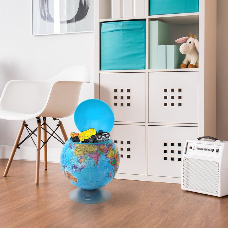 This is a globe. But better yet, it's a globe that will open in front of your eyes with a mere wave of your hand. Still better, though, it's a globe that will open in front of your eyes with a mere wave of your hand to access a storage space for toys and other playthings your little shaver uses every day. She can learn the geography of our planet while pulling out toys - and while putting them away.