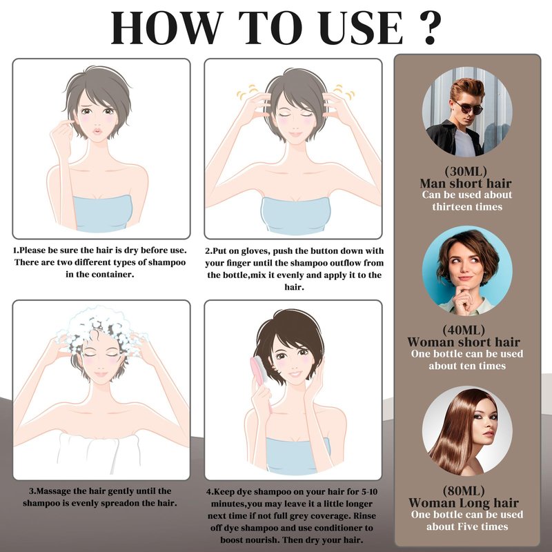 - Salon-Fresh Color, Effortlessly:Enjoy salon-quality color every day without the hassle. Our product is easy to apply in the shower without the need for pre-mixing. Simply wear gloves, create a lather with the hair color shampoo, apply it evenly to your hair, ensuring full coverage of each strand. Leave it on for 10-15 minutes, rinse, and achieve the hair color you desire. Our shampoo not only provides vibrant color but also helps rejuvenate your hair.