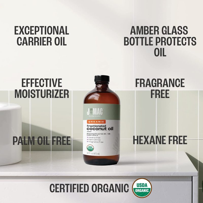 J MAC BOTANICALS Organic Fractionated Coconut Oil (16 Ounce Glass Bottle) Organic Carrier Oil and for DIluting Essential Oils, Moisturizer, Hair Care