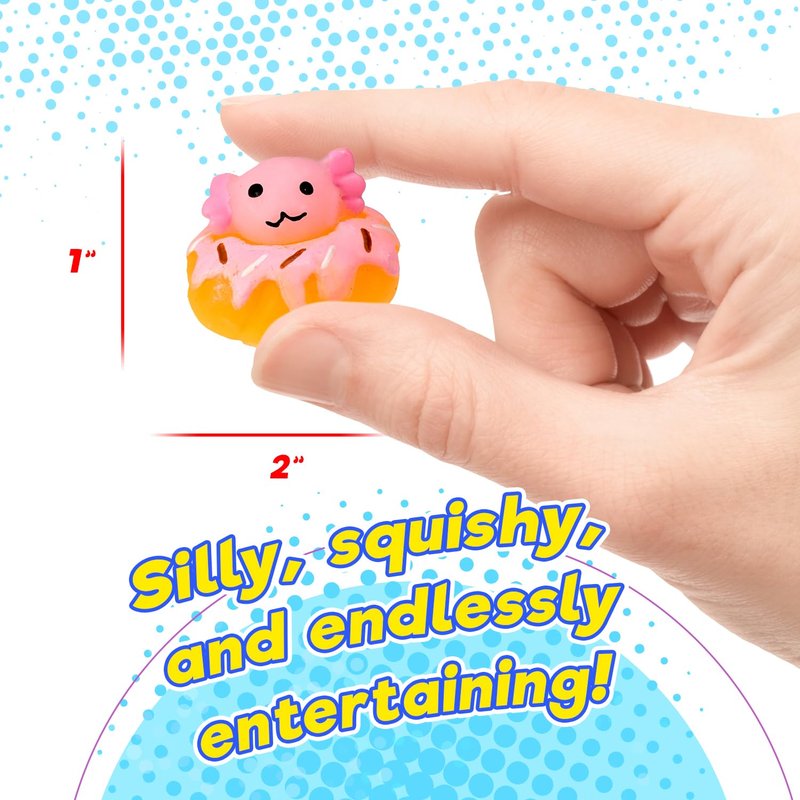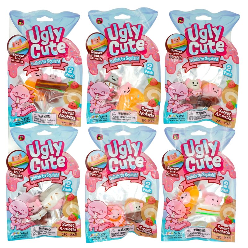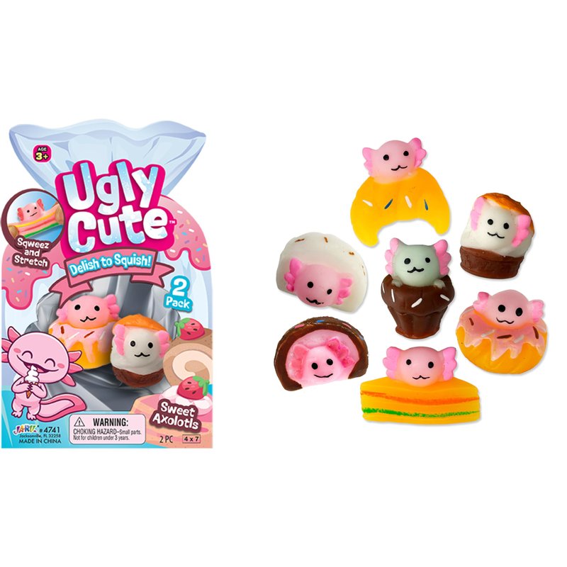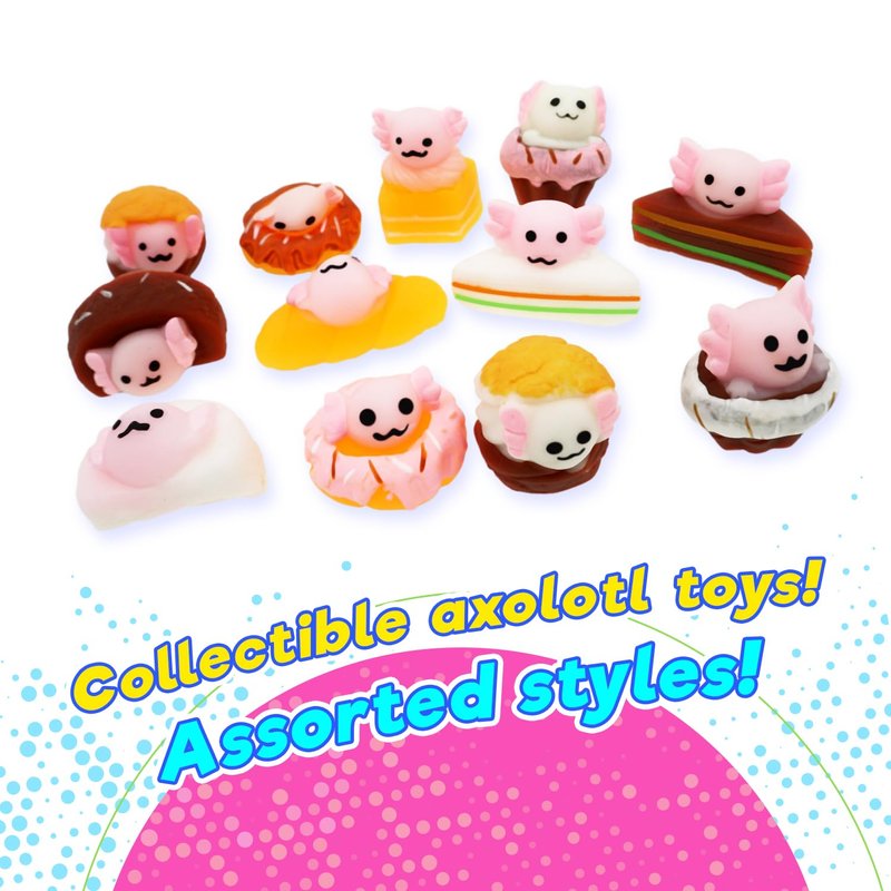 - Sweet Axolotl Toy for Kids - Includes 6 Packs / 2 Assorted in Each Pack. Squeezy Axolotl Squishies each (12 Units Total) packed in pairs. Fun Ugly Cute animal in delicious foodies squeeze toy. Cool bright shades, forms & colors (Cupcake, Pie, Donut, Croissant, Birthday Cake, Roll) Plus 1 FunaTon Sticker.