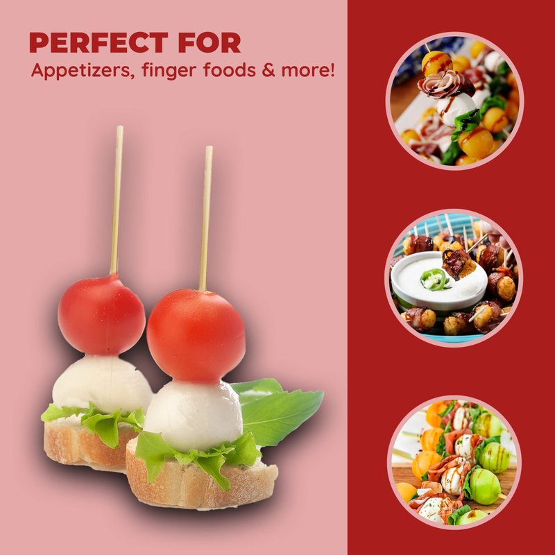 - MAIN USE: These short sized skewers are great for bite-sized treats. They are sturdy and durable withstanding the weight of various appetizers without breaking or splintering.