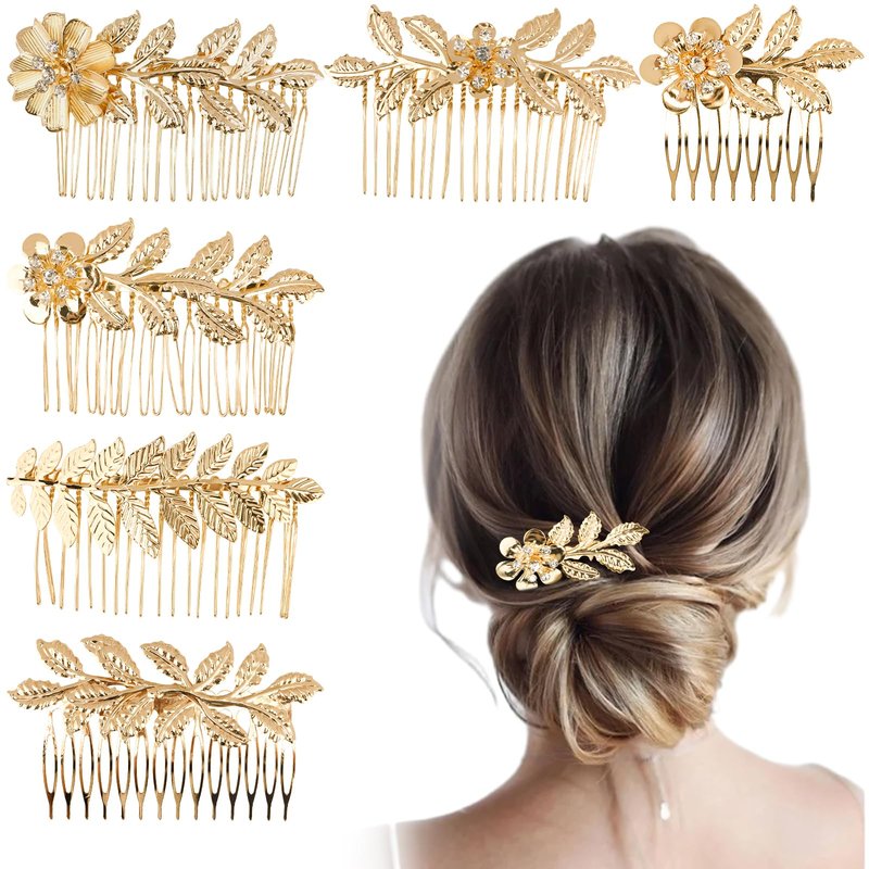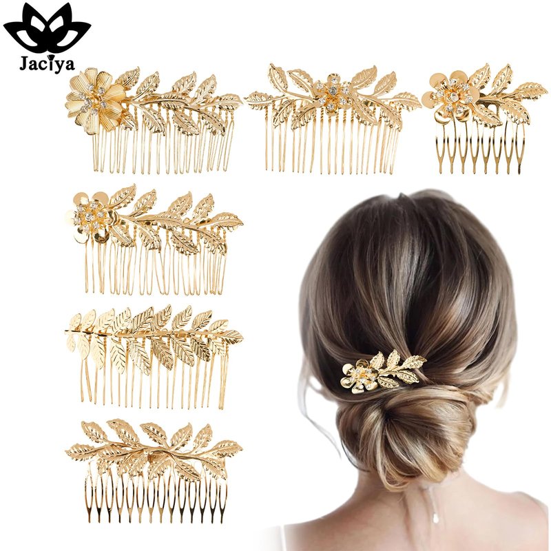 Jaciya Leaf Hair Comb Gold Hair Accessories Metal Hair Combs Rhinestone Flower Hair Side Combs Wedding Bridal Jewelry Hair Clips for Women GirlsQuantity: 2 * gold leaf hair combs, 4 * gold flower with rhinestones leaf hair combs