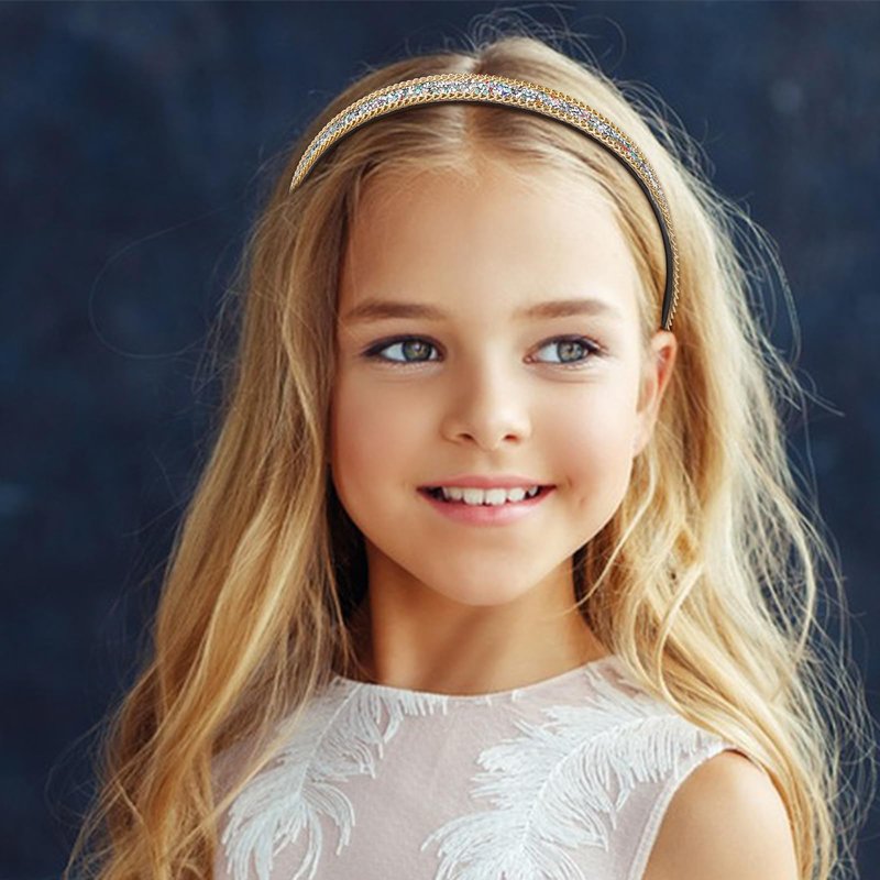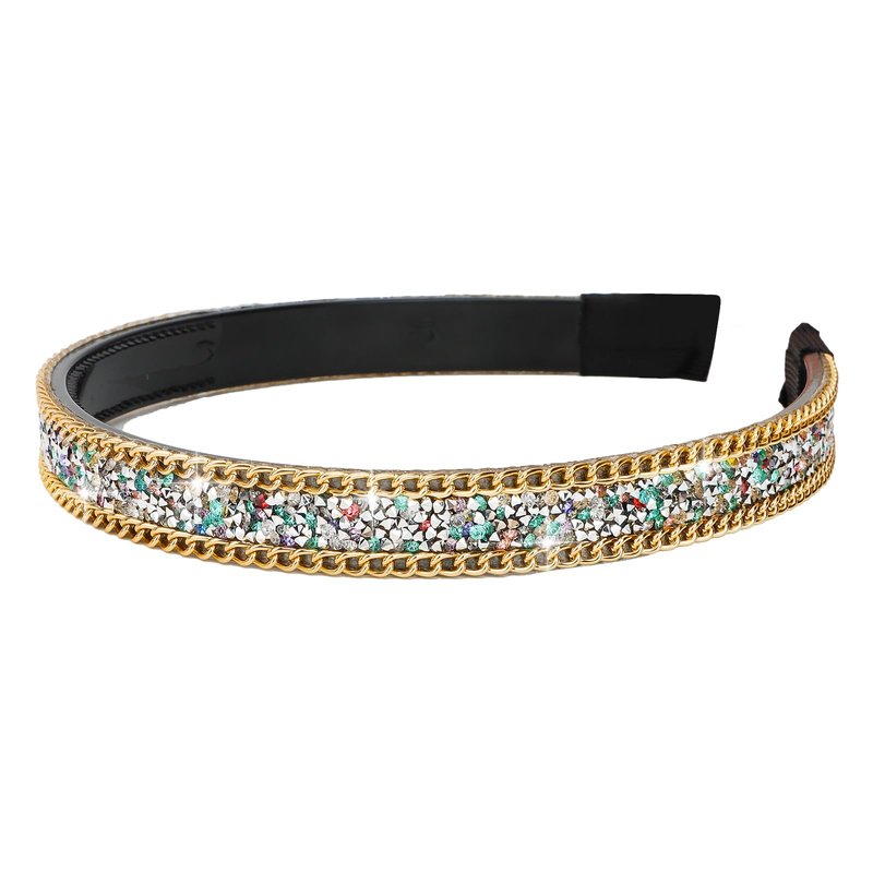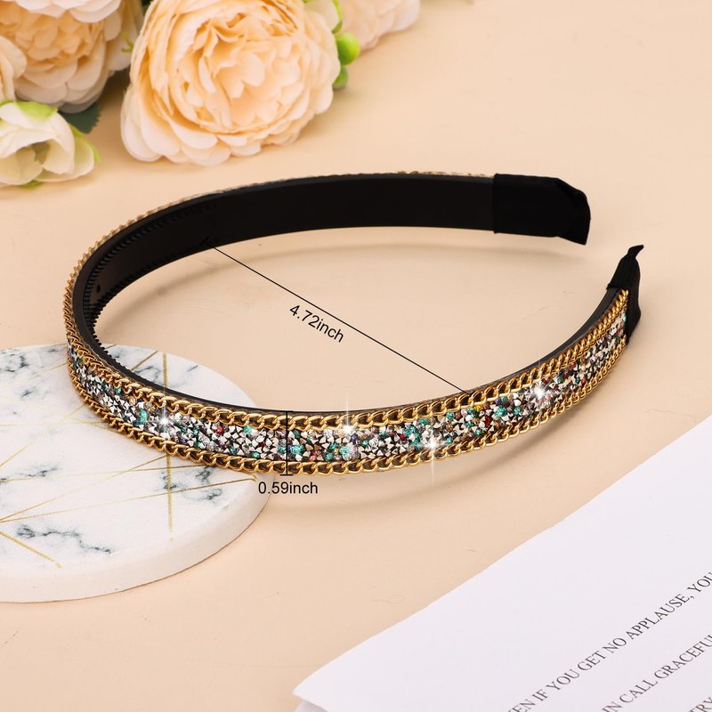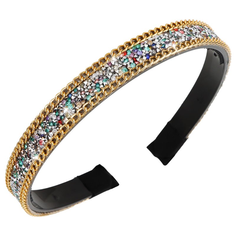 Presenting an elegant and glamorous bling bling rainbow rhinestone headband with gold chain that makes a gorgeous fashion statement. Rhinestone headbands for women features high-quality rainbow rhinestones of the same size arranged in a sophisticated design that captures light beautifully. The rhinestones have an elegant midnight rainbow color that coordinates perfectly with formal evening wear or adds a touch of luxury to casual looks. The consistent size and arrangement of the rhinestones gives this headband a clean, polished look. Created using premium materials and expert craftsmanship, this rhinestone hair accessory has a comfortable fit and the dazzling rhinestones stay securely in place. Dress up your hairstyle with this ornate and posh rainbow rhinestone headband that emanates luxury and glamour. The perfect accessory for brides, proms, parties or whenever you want to add some reflective sparkle to your look.
