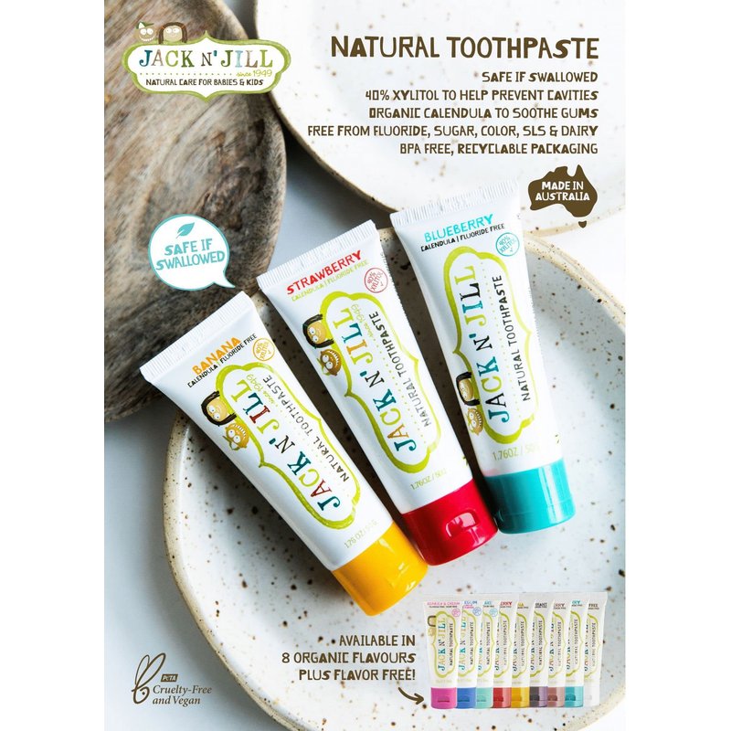 - NATURAL KID & TODDLER TOOTHPASTE - Jack N' Jill Kids Blueberry toothpaste for kids is expertly formulated with organic flavoring to be safe and best of all, this sugar-free toothpaste tasted so good, kids will want to brush! All Jack N' Jill Kids' toothpaste is fluoride-free, sugar-free and contain 40% xylitol, making it safe to swallow and the perfect natural training toothpaste for babies that will not upset little tummies!