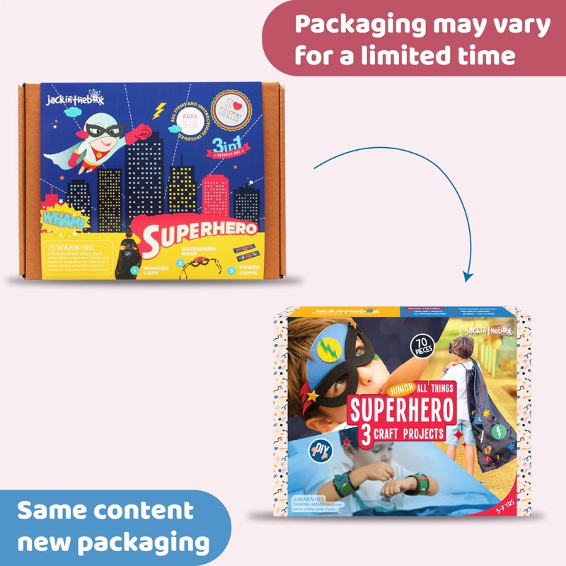 - The best costume pretend play box - Includes 3 projects --- 1.Wonder Cape: A dark black cape that you make using your own designed superhero signs, pow and boom and lots of lightning and glitter! 2. Superhero Mask: Do it as you like it - a powerful mask with wings, lightning, and stars to make you look like a real superhero 3. Power Cuffs: Make your cuffs and flaunt your powers as you wear them around both your wrists.
