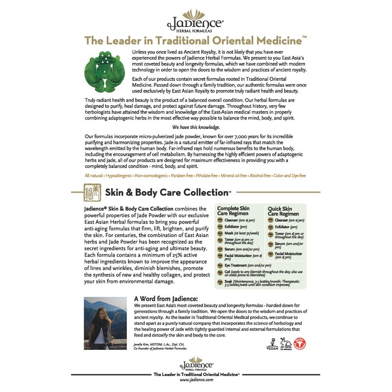 Today, thousands of estheticians and acupuncturists have added our superior Hydrating Mist toner to their facial treatments to help clients maintain a youthful-looking glow. Most importantly, Jadience Herbal Formulas uses adaptogenic herbs and each bottle contains a minimum of 25% active herbal ingredients that: