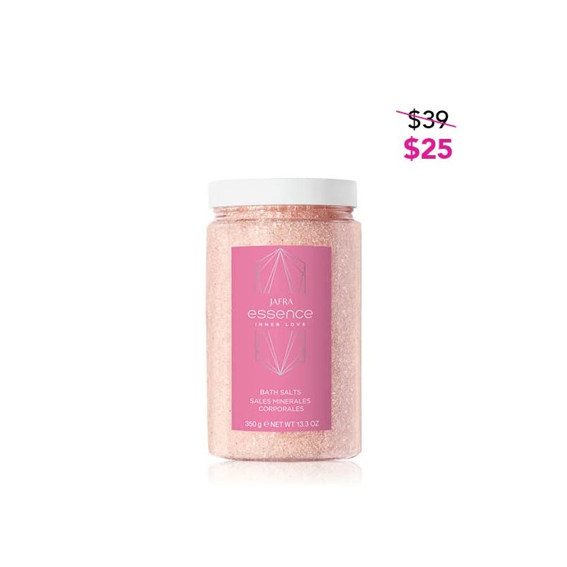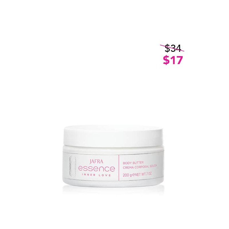 JAFRA Essence Inner Love Bath Salts Immerse yourself in a warm embrace with these skin-loving mineral bath salts, formulated with pink Himalayan salt, epsom salt and antioxidant vitamin E. JAFRA Essence Inner Love Shower Gel with Oil Notes of comforting cardamom, fresh white flowers and sensual musk soothe the senses and evoke calming energy. Inner Love Shower Gel with Oil gently sweeps away impurities while locking in moisture with rosehip oil and glycerin. Skin is left soft, smooth and lightly scented. JAFRA Essence Inner Love Body Butter Notes of comforting cardamom, fresh white flowers and sensual musk soothe the senses and evoke calming energy. Formulated with vitamin E and shea butter, this rich body butter blankets your skin in velvety softness and decadent hydration.