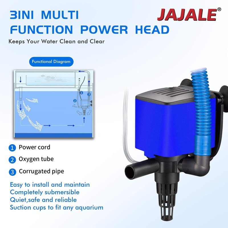 - 3-in-1 multi-function powerhead adds oxygen and filtration and water cycling for the fish tank.