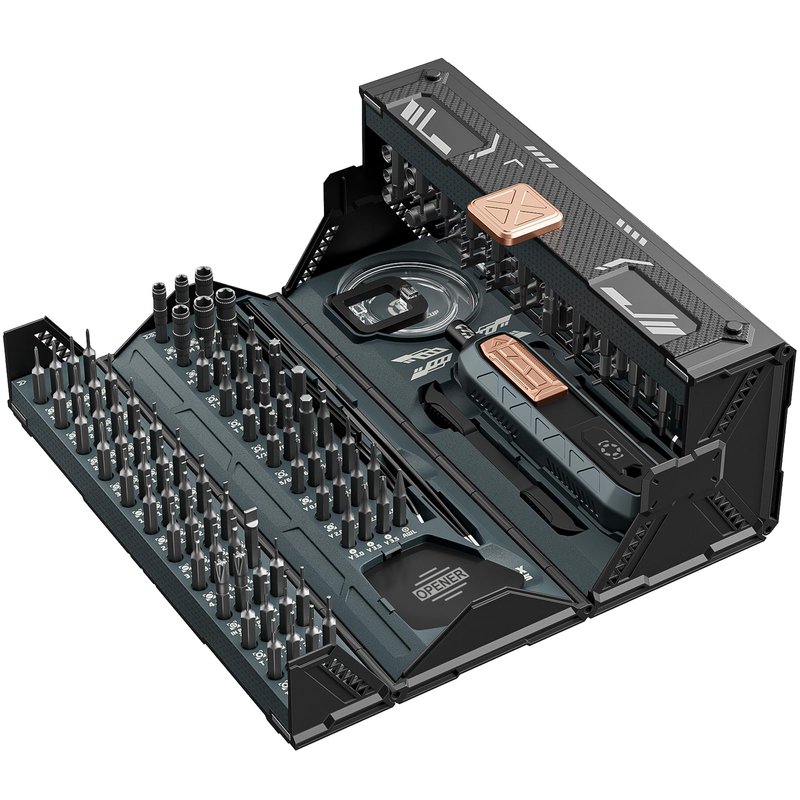 - 【APPROPRIATE SCREWDRIVER SET】 This compact screwdriver repair tool kit features a stackable design and shaped like a container, allowing multiple sets to be stacked. 160 common magnetic bits are built into the 4 partitions for easy access and won't fall out. Each bit is marked with standard or inch markings for quick identification of the screwdriver bit you need. Also included are straight and curved ESD tweezers, opening picks, crowbar, suction cup for easy screen removal and carrying.