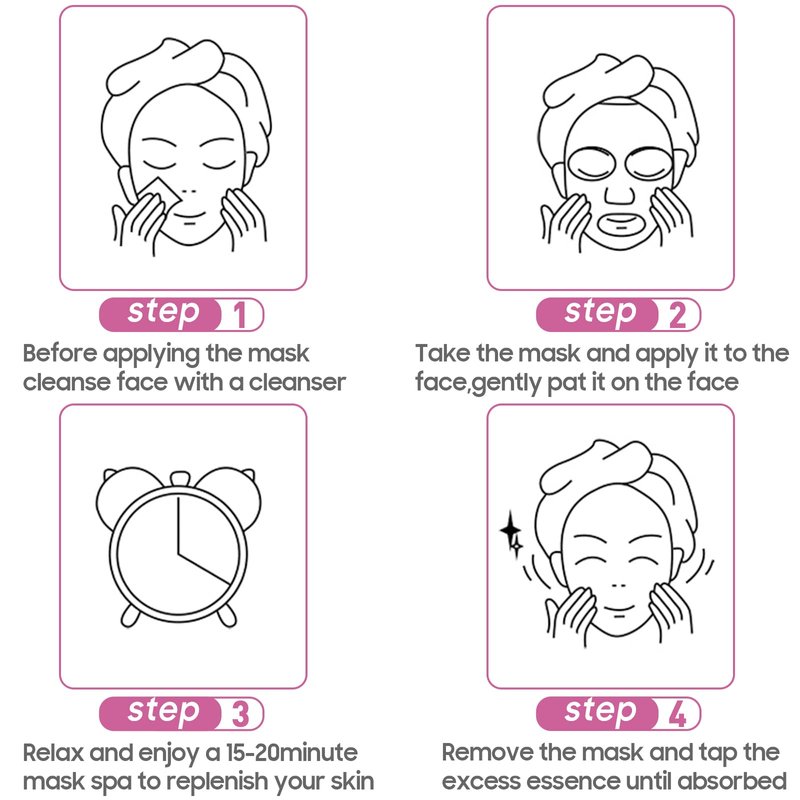 2)Unfold the facial mask,Apply to the face,and gently pat it against the face.Smoothing the face masks facial patches gently to ensure good contact with the skin.