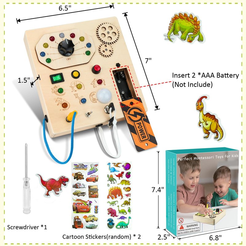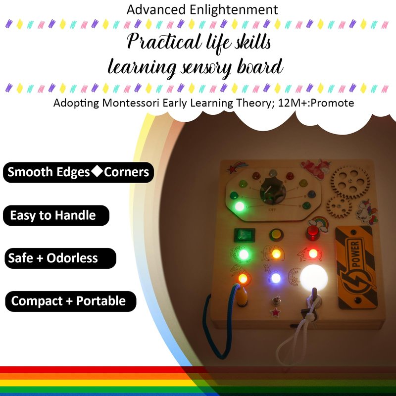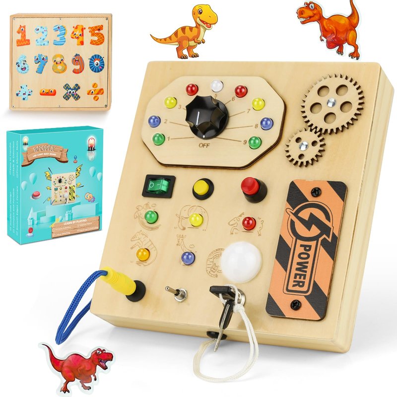 - Montessori Busy Board: This Montessori toys for 1 year old are constructed by various colorful led lights, different type of button switch, knob control, toggle switch, key switch, pluggable wire, manual gear. Your baby will be entertained for hours with endless switch buttons, light combinations and wires, gear, encourage preschoolers to learn practical life skills through hands-on practice. Baby busy board needs 2 *AAA Batteries (Not Included)