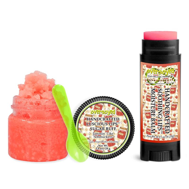 Jammin' Like Schmuckers Soothing & Luscious Lips by OverSoyed Exfoliator & Chapped Lip Repair Lip Care Combo | Artisan Handcrafted to Order Strawberry Jelly Sugar Sweet Lemon Flavored Exfoliating Sugar Lip Scrub & Lip Moisturizer Balm Gift Set
