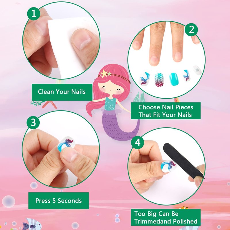 - How to Use: We have pre-glued on the back of the false nails, you don’t need to buy another gel, so you can have beautiful hands more quickly. First remove the moisture and oil from the original nails. Then choose the right size to stick on nails for kids, press for 5 seconds. If the size is too large, you can trim and polish
